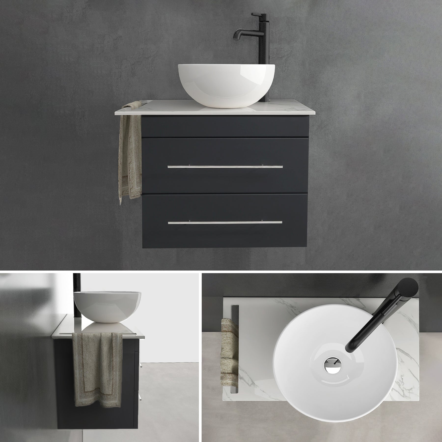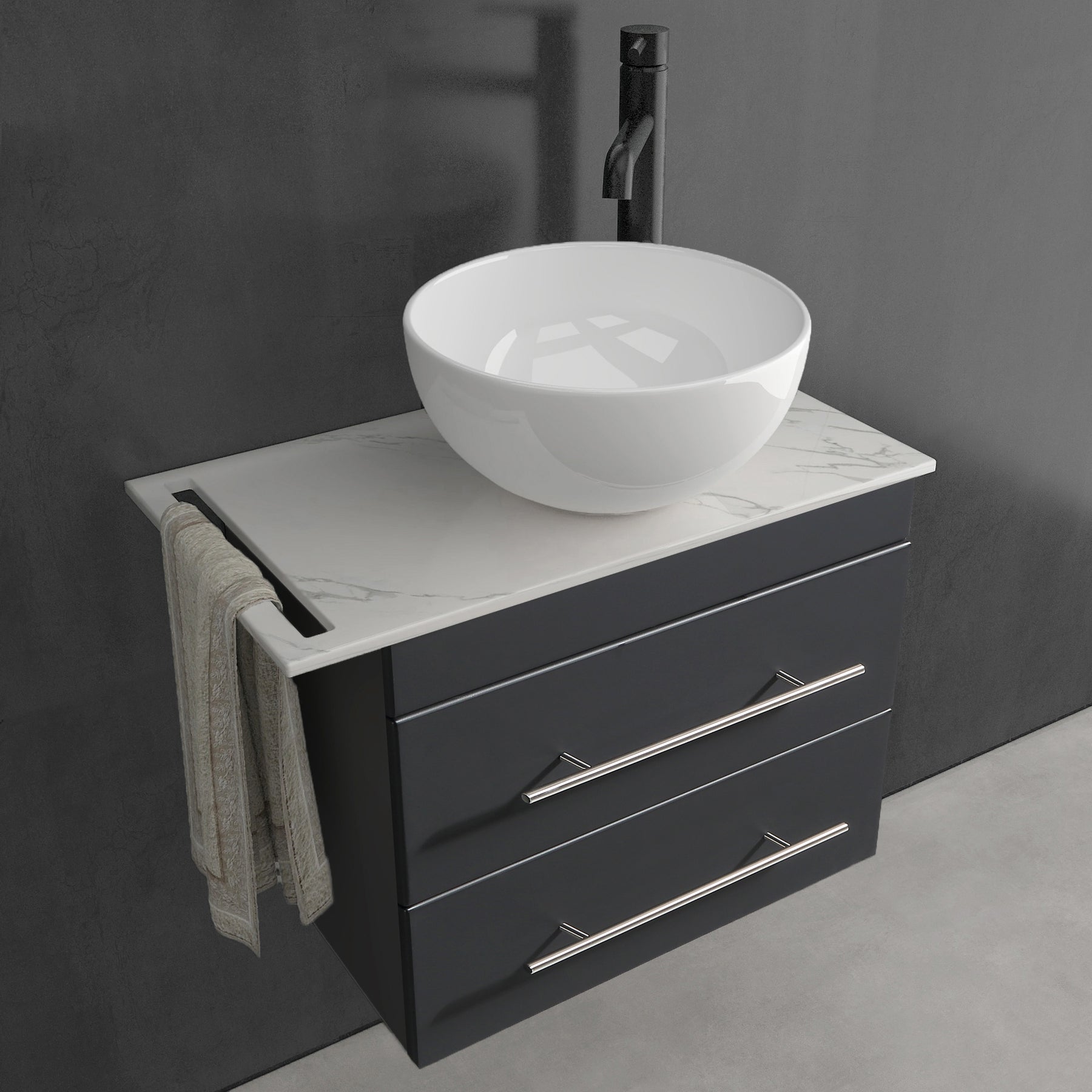 Unterschrank Mini-600-Schwarz Matt + Keramik Waschbecken 340-601D + Calacatta-Platte
