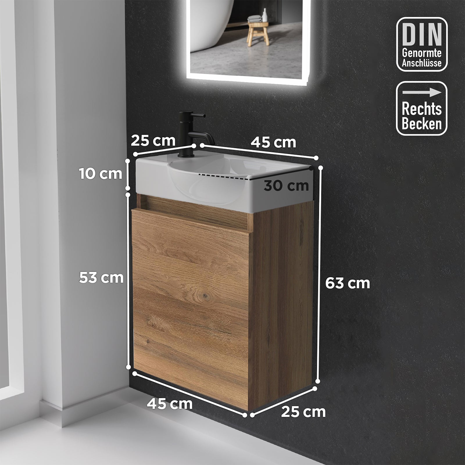 Alpenberger Keramik Waschbecken 45 cm mit Unterschrank | Badmöbel Set für Gäste WC | Rechts Bamboo