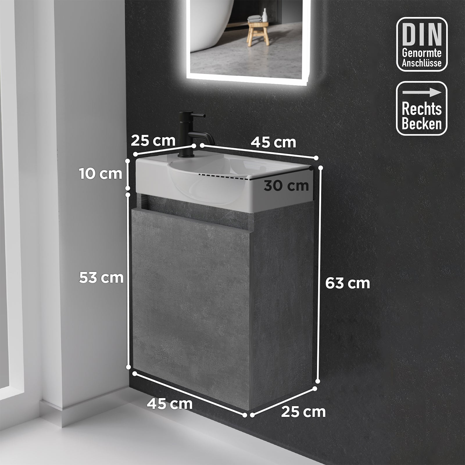 Alpenberger Keramik Waschbecken 45 cm mit Unterschrank | Badmöbel Set für Gäste WC | Rechts Cement