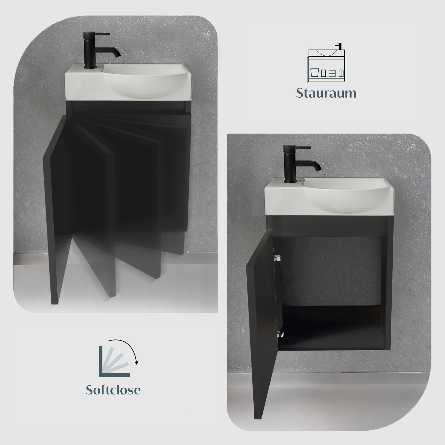 Alpenberger Keramik Waschbecken 45 cm mit Unterschrank | Badmöbel Set für Gäste WC | Rechts Schwarz Matt