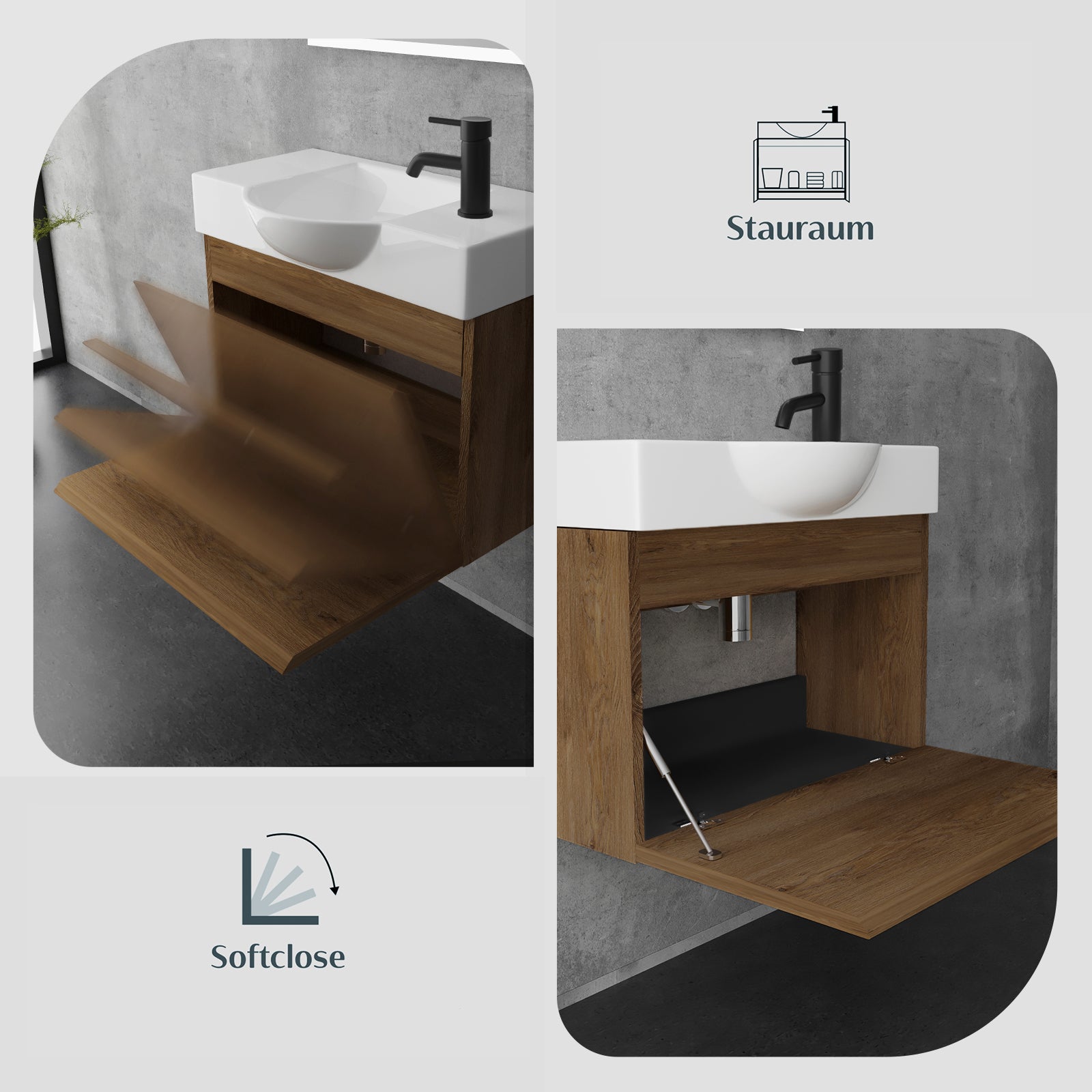 Modernes Badmöbel Set, bestehend aus einem hochwertigen Keramik-Waschbecken (55 cm), einem eleganten Unterschrank mit Softclose-Funktion und einem LED Spiegel mit Touch-On/Off. Perfekt geeignet für kleine Badezimmer oder Gäste-WCs.