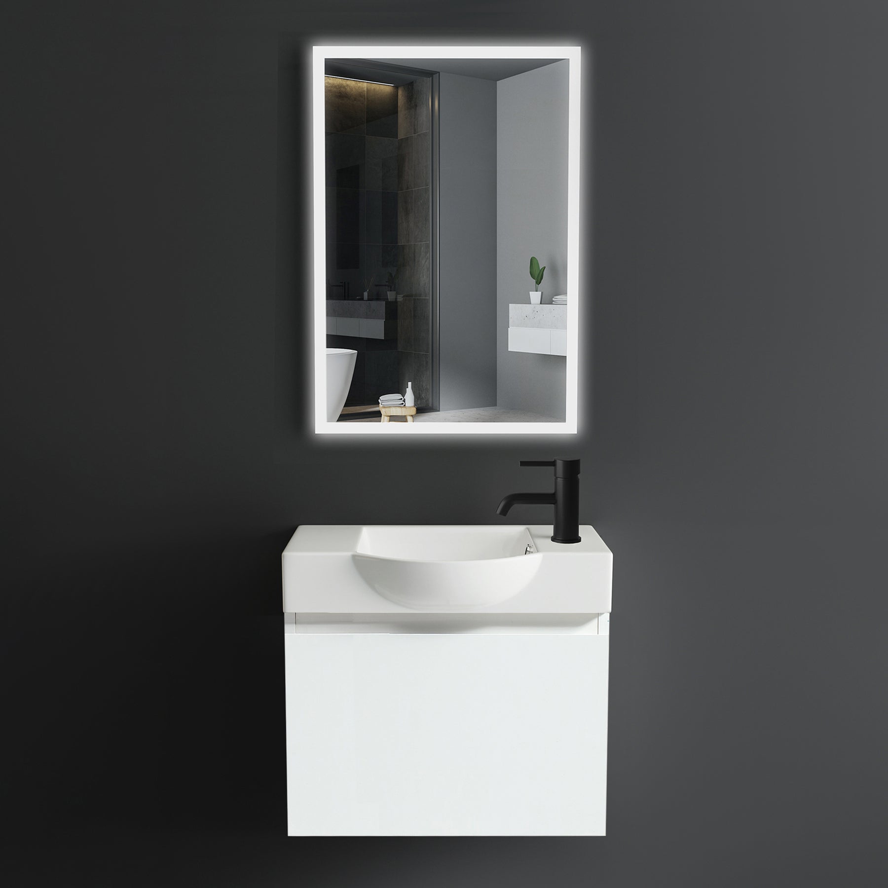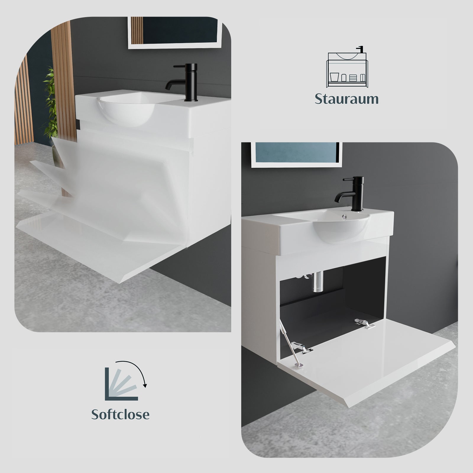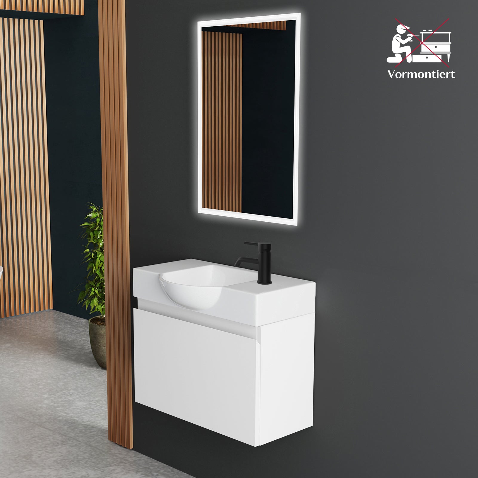 Modernes Badmöbel Set, bestehend aus einem hochwertigen Keramik-Waschbecken (55 cm), einem eleganten Unterschrank mit Softclose-Funktion und einem LED Spiegel mit Touch-On/Off. Perfekt geeignet für kleine Badezimmer oder Gäste-WCs.